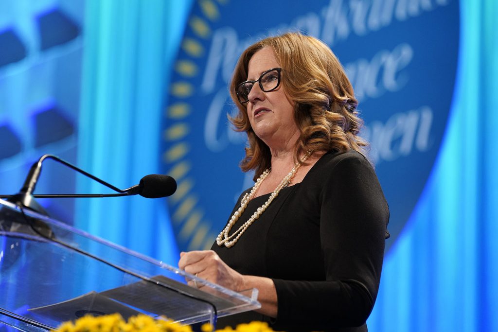 Chief information officer of QVC Group Karen Etzkorn speaks on stage during Pennsylvania Conference for Women 2018 at Pennsylvania Convention Center on October 12, 2018 in Philadelphia, Pennsylvania. (Photo by Marla Aufmuth/Getty Images )